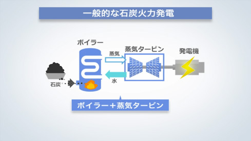 ボイラー内で石炭を燃焼したときに発生する熱を利用して、水を蒸気に変え、この蒸気の膨張力によって蒸気タービンを回転し、発電します。
