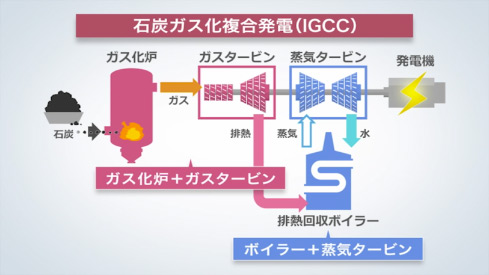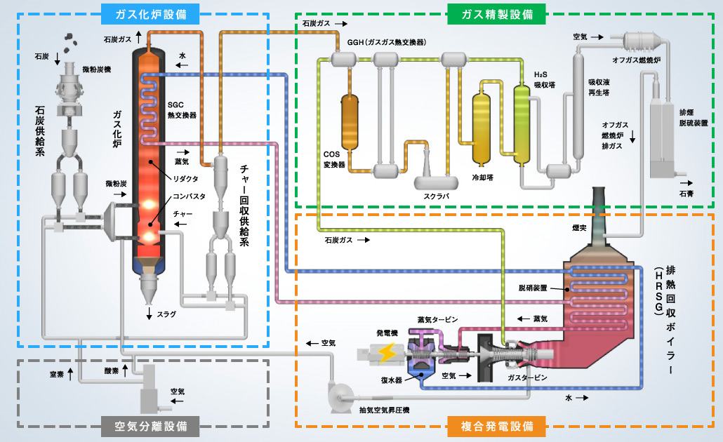 石炭をガス化し、ガスタービンと蒸気タービンで構成される複合発電設備(コンバインドサイクル)によって、一般的な石炭火力発電よりも効率よく発電するシステムのことです。