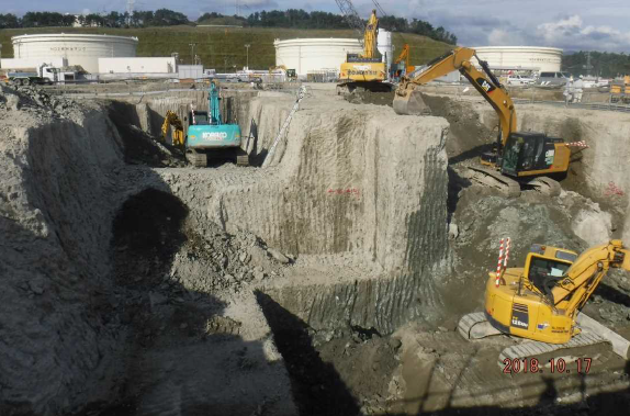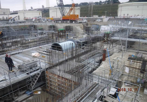 2018.11.08 工事進捗状況をお知らせします。(2018年10月末) 現在、土木建築工事が順調に進んでおります。 ・タービン建屋・排熱回収ボイラー・ガス化炉エリアの基礎構築中 ・屋内貯炭場エリアの掘削・地盤改良中 ・放水路エリアの循環水管の据付施工中 写真上:ドローンによる工事エリア全景(10/22撮影)(三菱日立パワーシステムズ株式会社提供) 写真中:タービンエリア配筋・型枠(10/11撮影) 写真下:屋内貯炭場エリア掘削(10/17撮影) リストに戻る